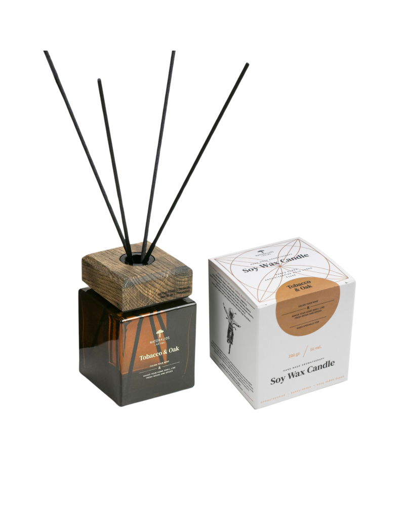 „TOBACCO & OAK“ kompozicija, neįkyriai, jus supančiai erdvei suteikia paslaptingumo ir prabangos jausmą. Įkvėpus šios aromatų kompozicijos norisi užsimerkti, giliau įkvėpti ir iškvėpti. Nenuostabu...be tabako žiedų, kurių kvapas gali veikti balansuojamai, raminančiai, čia susipina nardų eterinis aliejus, kuris nuramina tuos, kuriuos kankina nerimas ir įtampa. Savo savybėmis neatsilieka juodieji pipirai, aromaterapijoje juodųjų pipirų eterinis aliejus laikomas šildančiu, stiprinančiu protą ir dvasią. Šių eterinių aliejų raminančias, harmonizuojančias savybes papildo gvajako medienos eterinis aliejus, kuris atpalaiduoja, mažina stresą, yra tinkamas meditacijai. Kompozicijai lengvumo, įliedami truputėlį citrusų gaivos, suteikia bergamotė ir kartusis apelsinas.